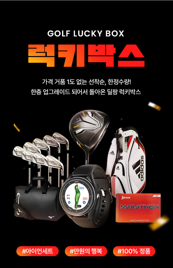 딜팡 단독 스페셜 럭키박스는 골프 애호가라면 꼭 도전해볼 가치가 있습니다. 실용적인 구성품과 고가 상품에 대한 기대까지 더해져 최고의 가성비를 제공합니다. 한정수량이라 빠른 구매가 필수입니다!