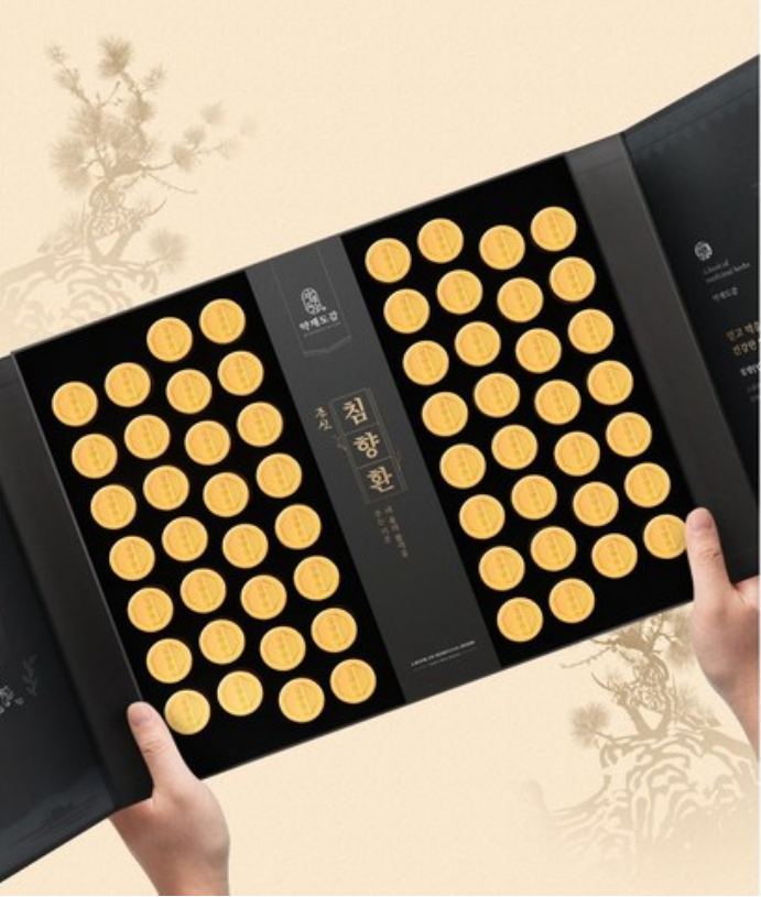 바로 ‘약재도감 조선 침향환’, 고급 쇼핑백까지 함께 구성되어 있어 선물용으로도 정말 근사하더라고요.