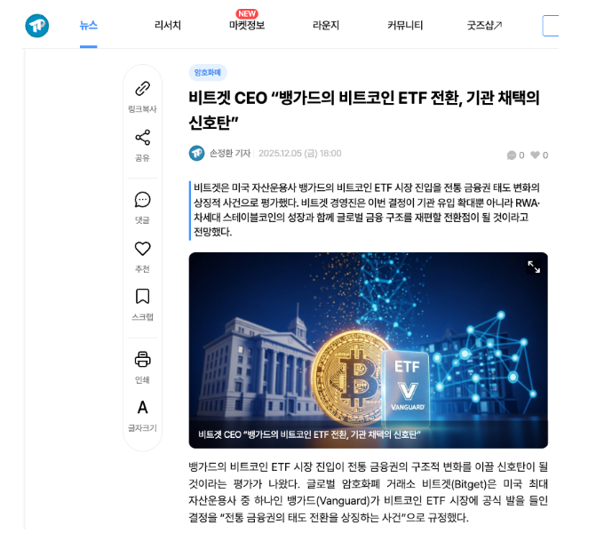 미국의 초대형 자산운용사 뱅가드(Vanguard)가 드디어 비트코인 ETF 시장에 뛰어든 걸 두고 이렇게 말했어요.