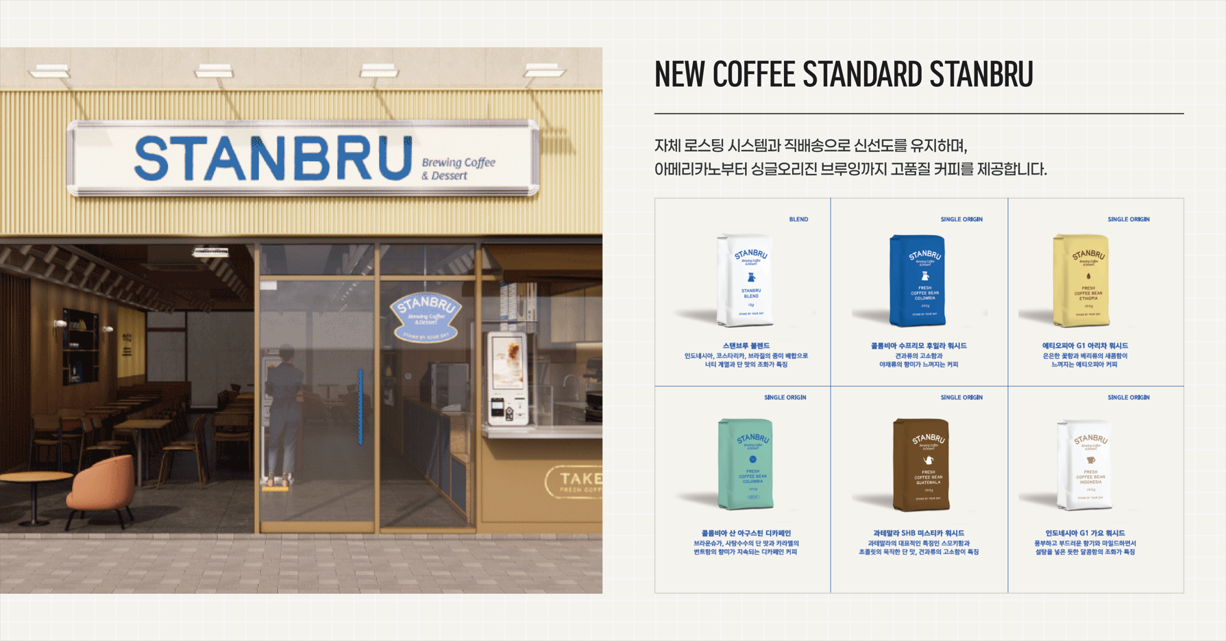 스탠브루는 롯데GRS가 선보인 브루잉 커피 중심 브랜드로, 브루잉 커피를 좀 더 일상적으로 즐길 수 있게 만든 점이 인상적이더라고요. 롯데GRS 공식 브랜드 페이지에서도 브루잉 커피를 중심으로 에스프레소 커피, 베이커리, 케이크, 원두 등을 함께 운영하는 브랜드로 소개하고 있어요.