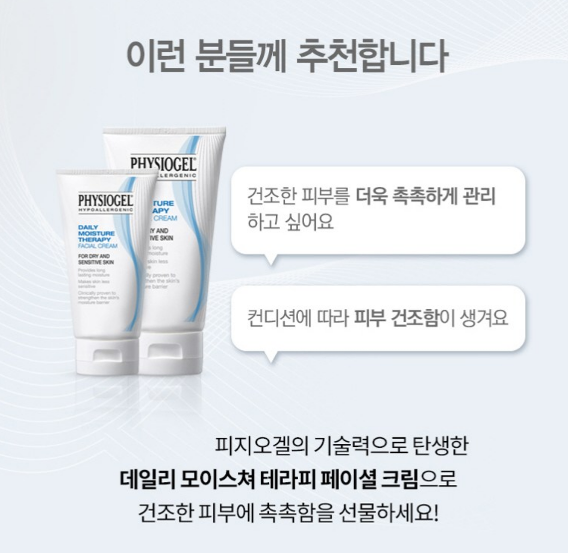 피지오겔 데일리 모이스처 세러피 페이셜 크림은 피부의 깊은 층까지 수분을 공급하여 건조함을 느끼지 않도록 도와줍니다. 특히 겨울철 건조한 날씨에도 피부를 촉촉하게 유지해 줍니다.
